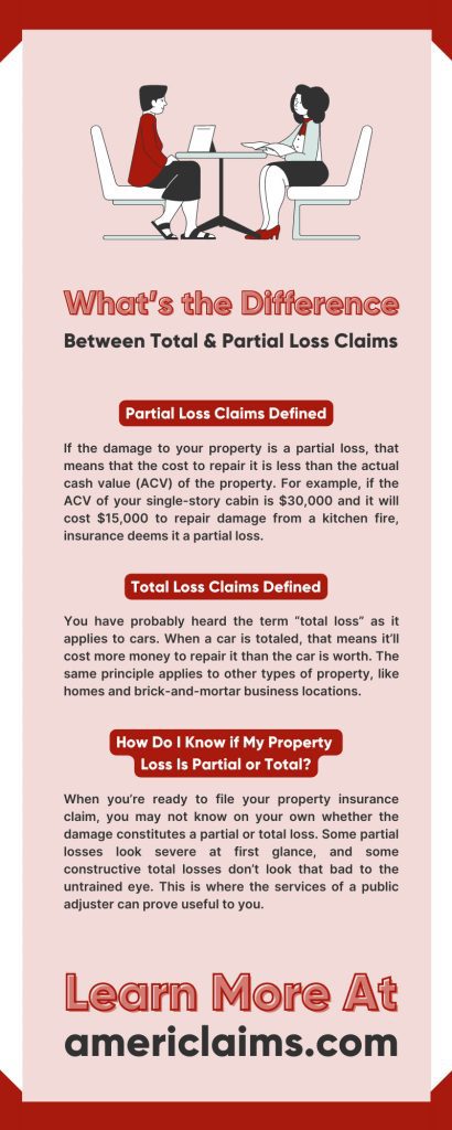 How badly was your property damaged, though? Will you need to file a partial loss or a total loss claim? Let’s take a closer look at the differences between the two—knowing how severe the damage is can help you decide whether to hire a public adjuster for assistance.